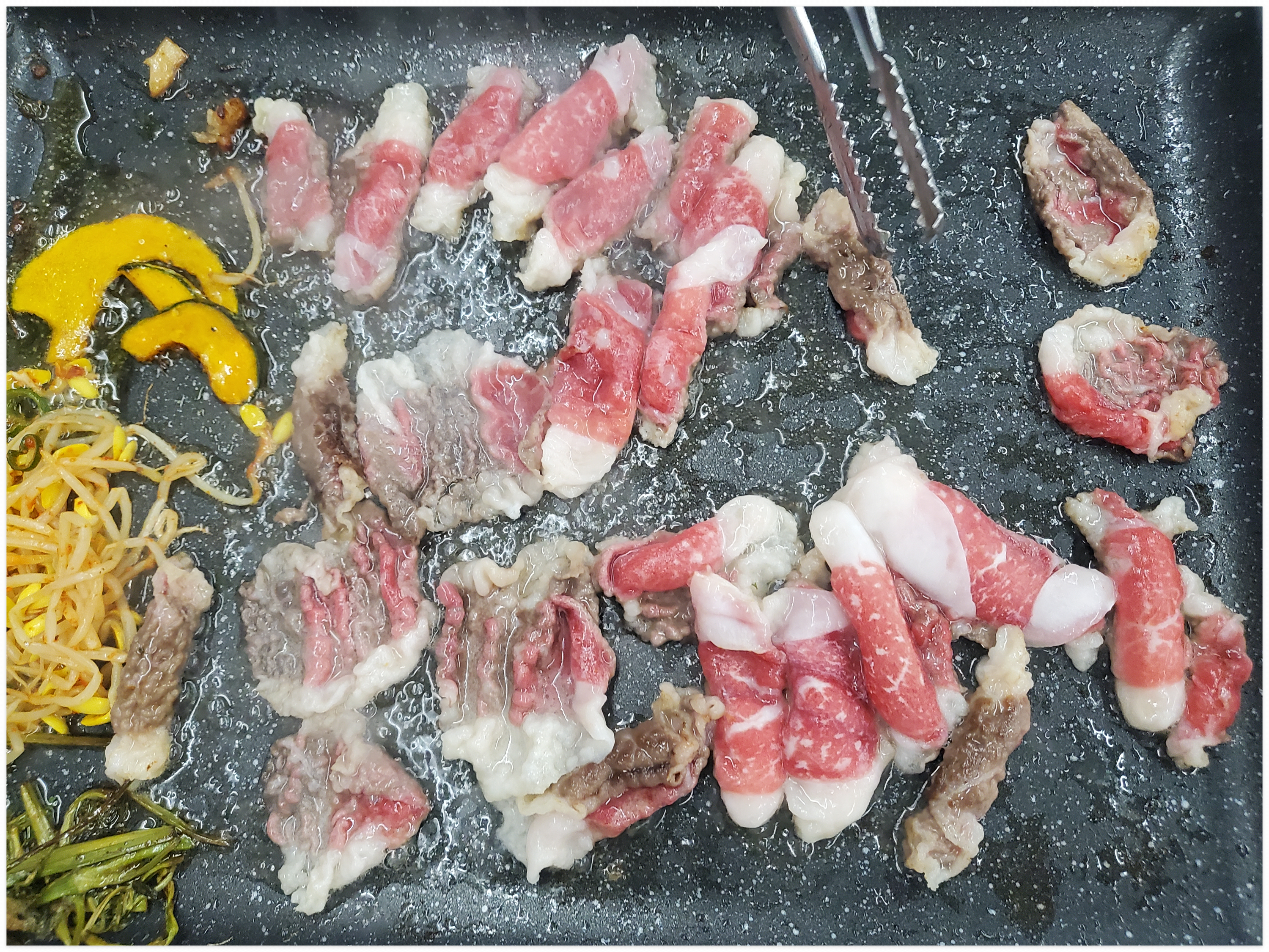 이 집의 대표 메뉴는 역시 대패삼겹살입니다. 고기가 얇게 썰려 있어 금방 익고, 기름기가 적당히 빠지면서 고소한 풍미가 입안 가득 퍼져요. 한 번 집어 불판에 올리면 순식간에 익어 손이 쉴 틈 없이 바빠지는 매력! 함께 구워 먹는 버섯, 호박, 콩나물까지 어우러져 조화로운 맛을 만들어줍니다.
