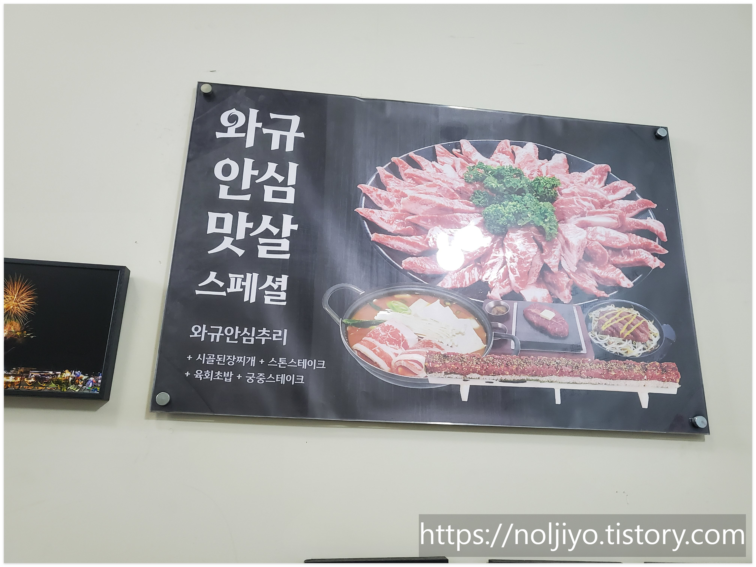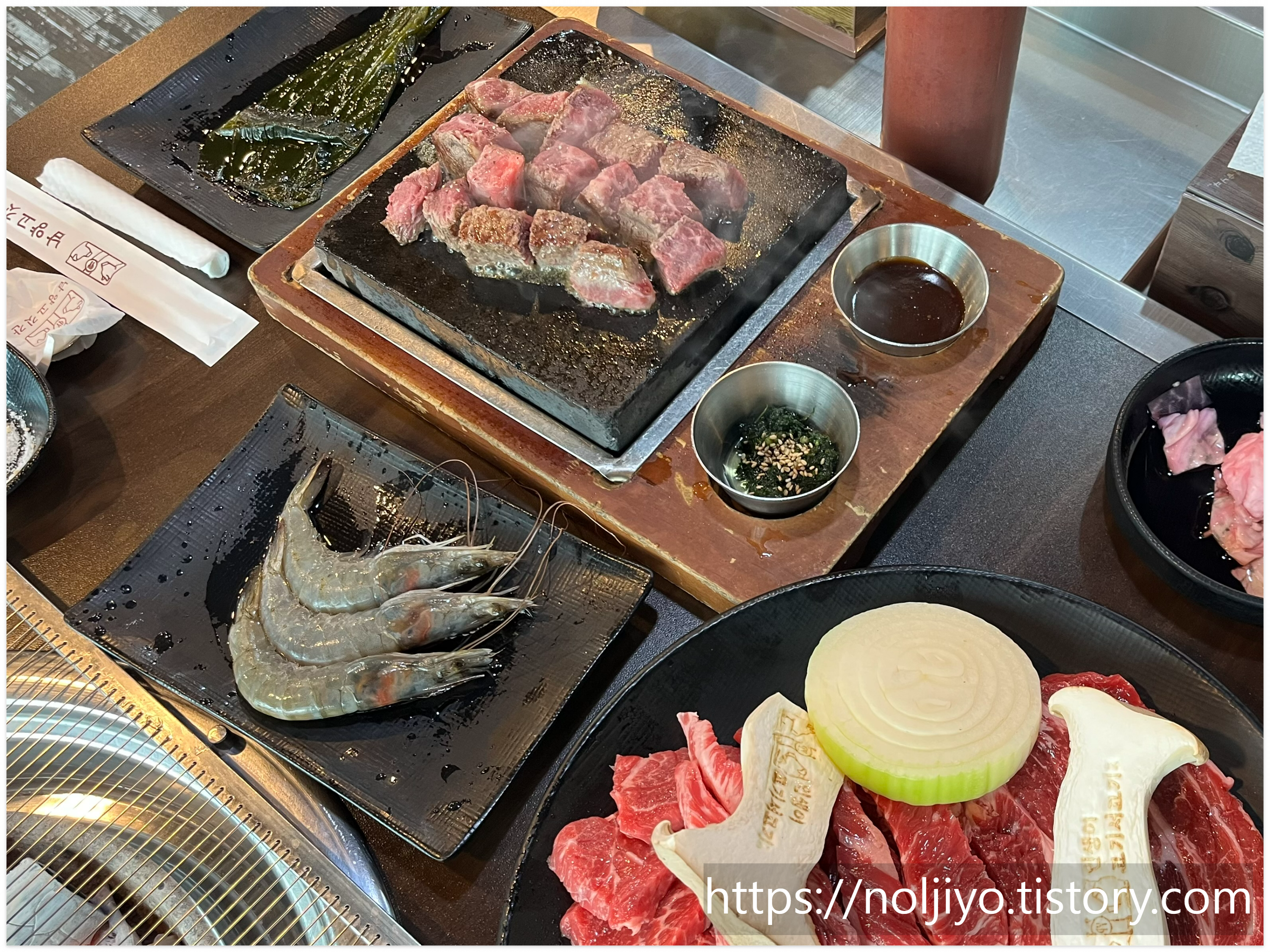 제가 주문한 메뉴는 와규 안심 맛살 스페셜이었는데요, 돌판과 숯불을 함께 활용해 고기를 구워내는 방식이라 풍미가 정말 좋았습니다. 육즙이 살아있는 스톤 스테이크, 고소한 육회초밥, 그리고 구이용 고기가 푸짐하게 나와서 가격 대비 만족도가 높았습니다.