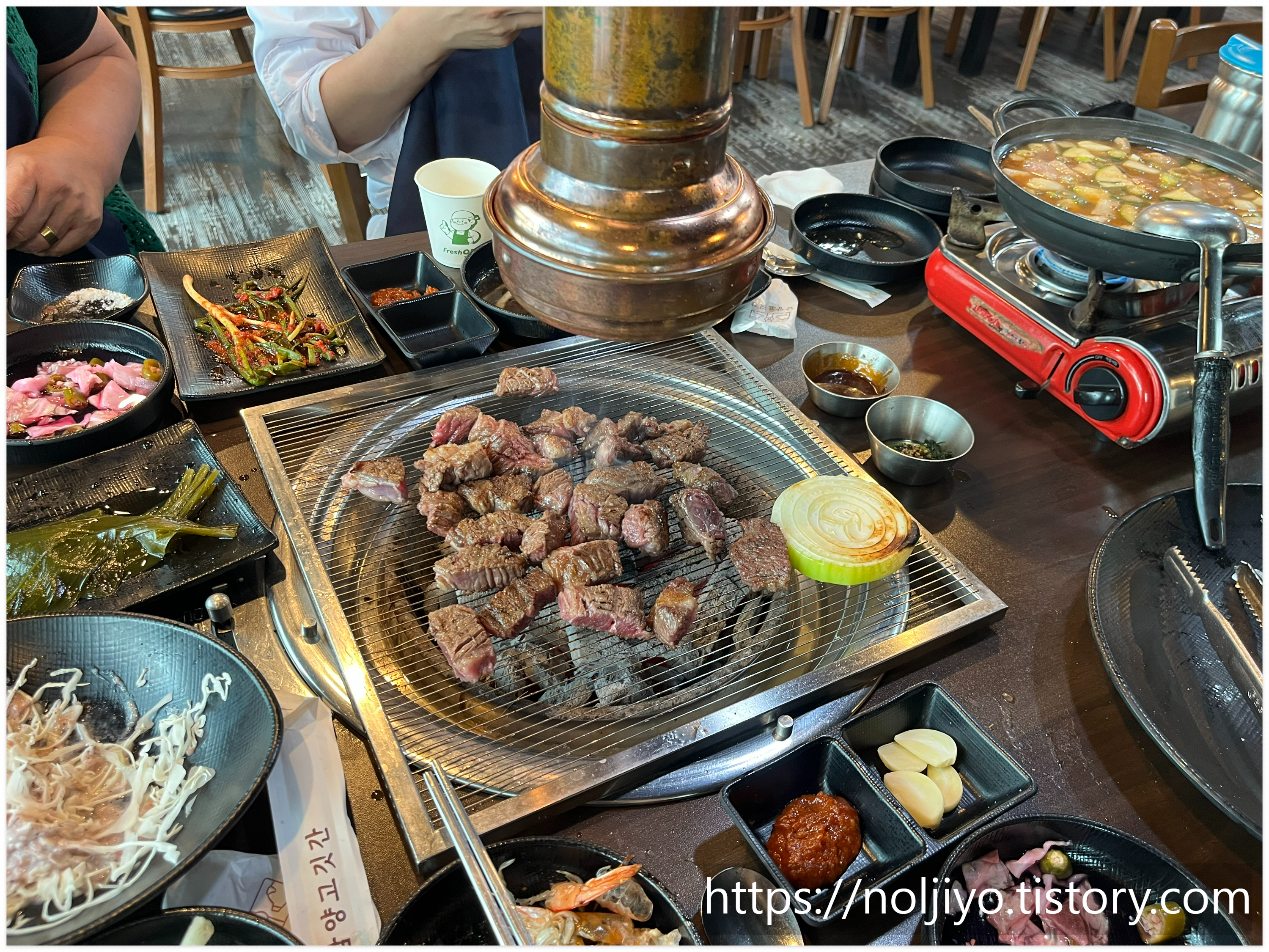 고기만 좋은 게 아니라 시골 된장찌개가 함께 나와 구수한 맛을 더해줍니다. 반찬도 다양하게 준비되어 있어 고기와 곁들여 먹기 딱 좋았습니다. 무한리필 이용 시간은 2시간으로 안내되어 있는데, 고기를 천천히 즐기면서도 충분히 배부르게 먹을 수 있는 시간입니다.